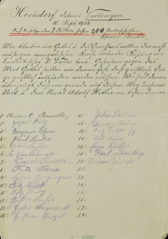 Brendle, der seinem Dienstheft (ein Teil seines Nachlasses, der hier im Landeskirchlichen Archiv aufbewahrt wird) eine Porträtfotografie seines Landesbischofs Wurm beilegte, müssen die Vorgänge um dessen Absetzung im fortlaufenden Kirchenkampf äußerst bewegt haben. Wie tausend andere evangelische Gemeindemitglieder und Pfarrer entschloss er sich, Initiative zur Solidarität mit Wurm zu ergreifen und selbst seinen Part im Spiel der Geschichte zu übernehmen. Im Jahr des Ereignisses, 1934, war Brendle Pfarrer in der kleinen Gemeinde Hochdorf an der Enz nahe Vaihingen an der Enz. Auf seine Initiative hin wurden in der Gemeinde Unterschriften gesammelt, um zu protestieren.