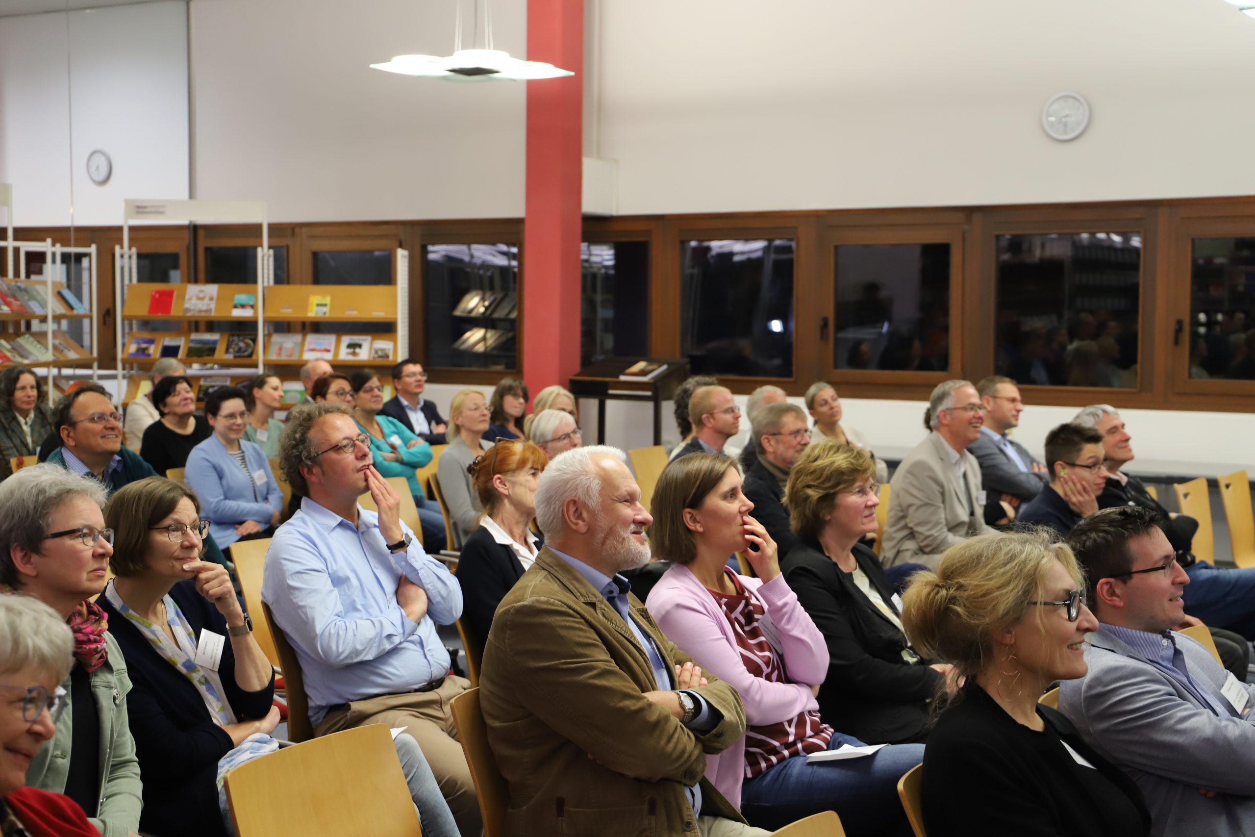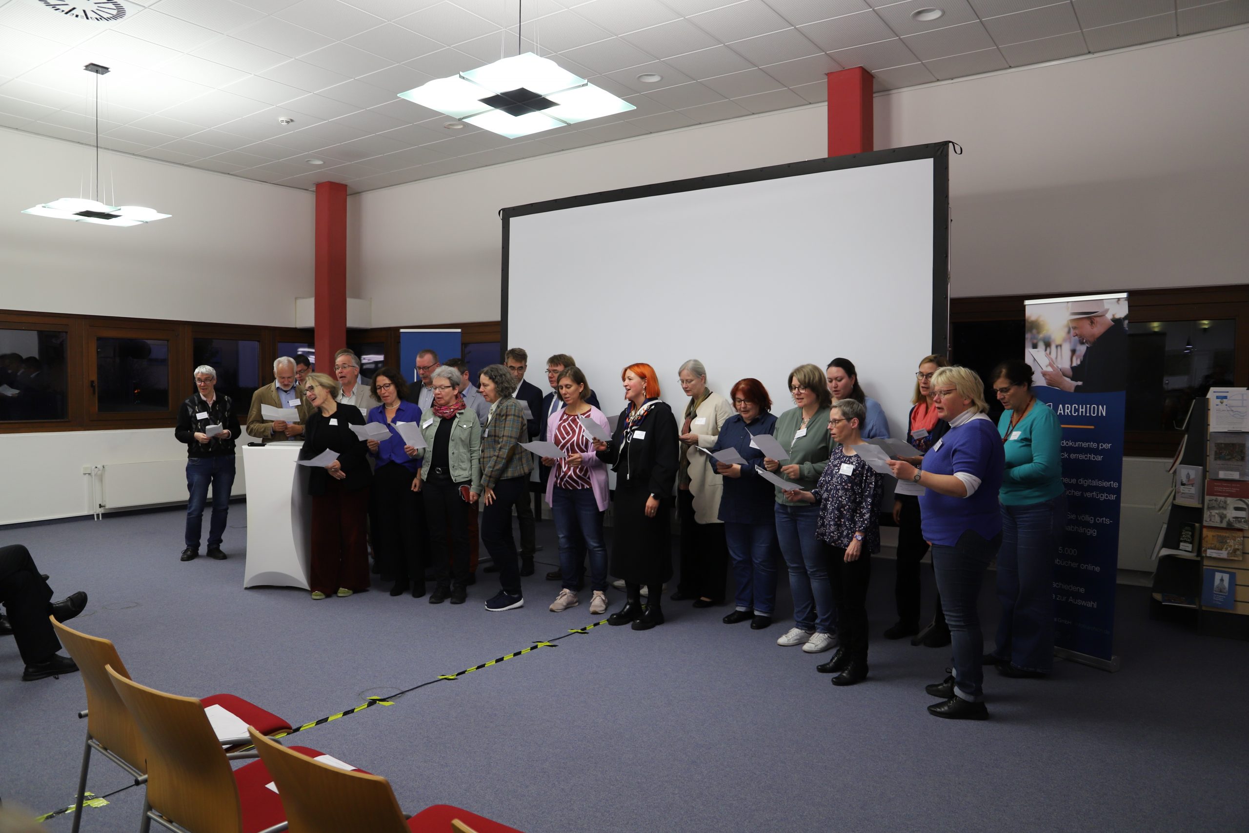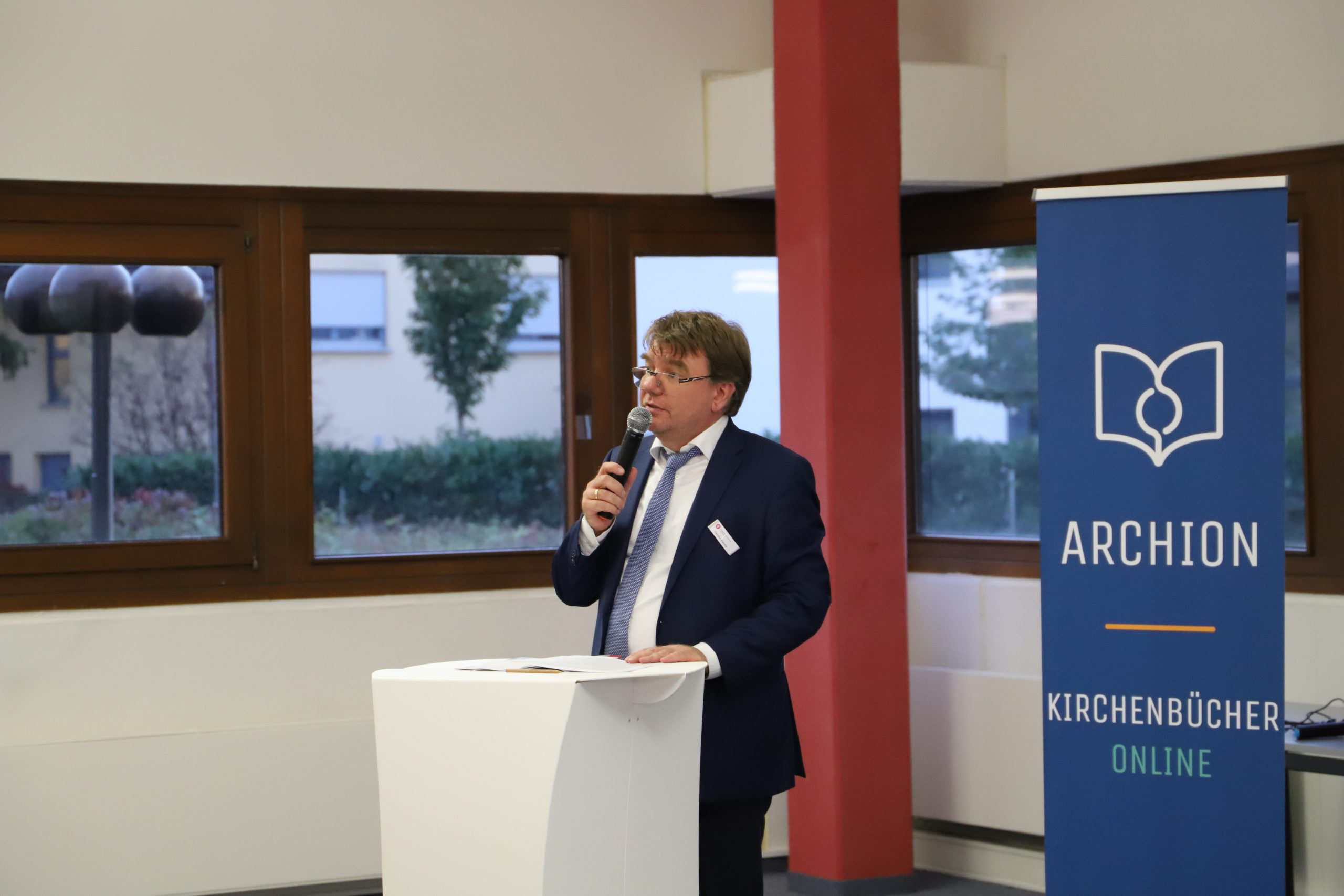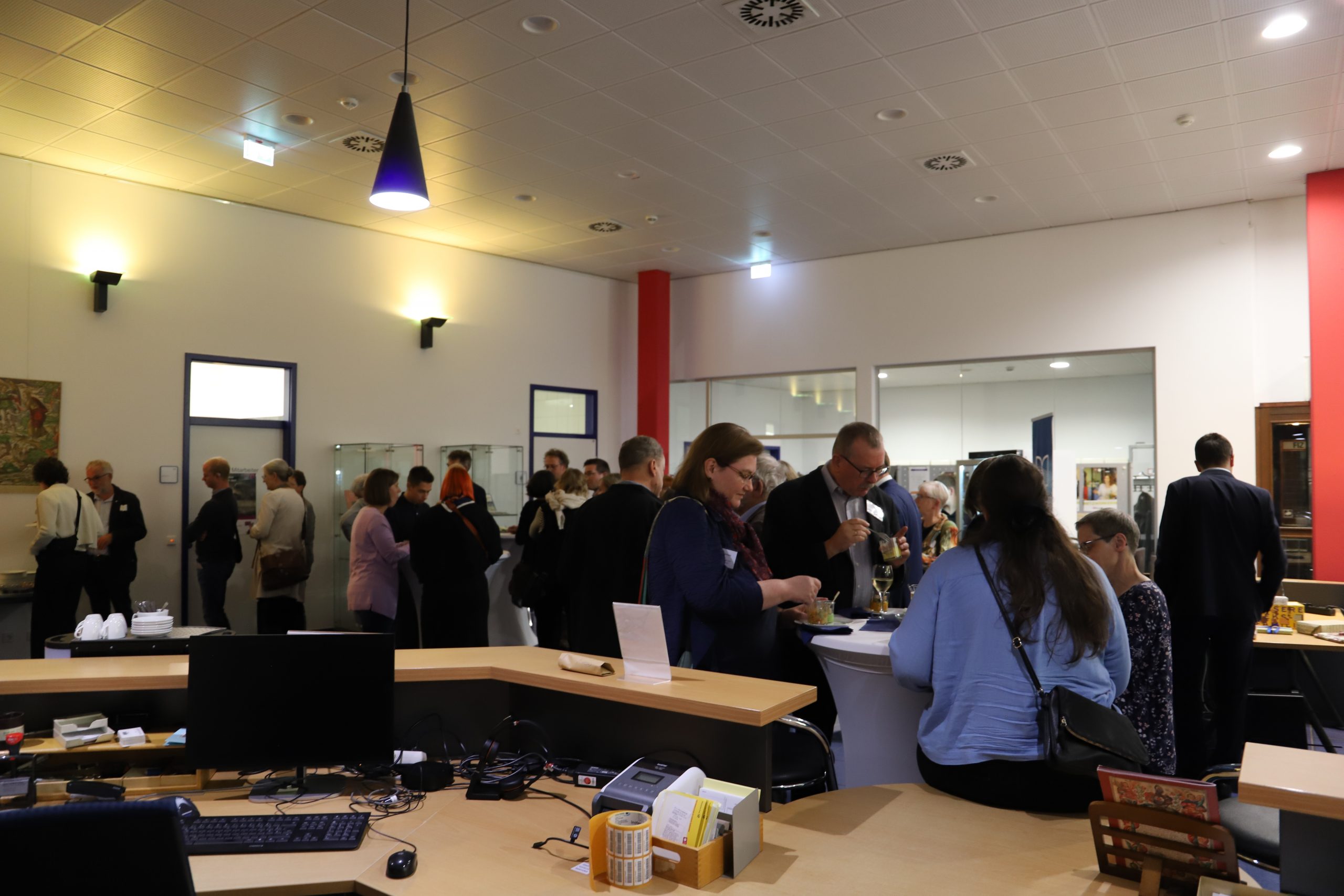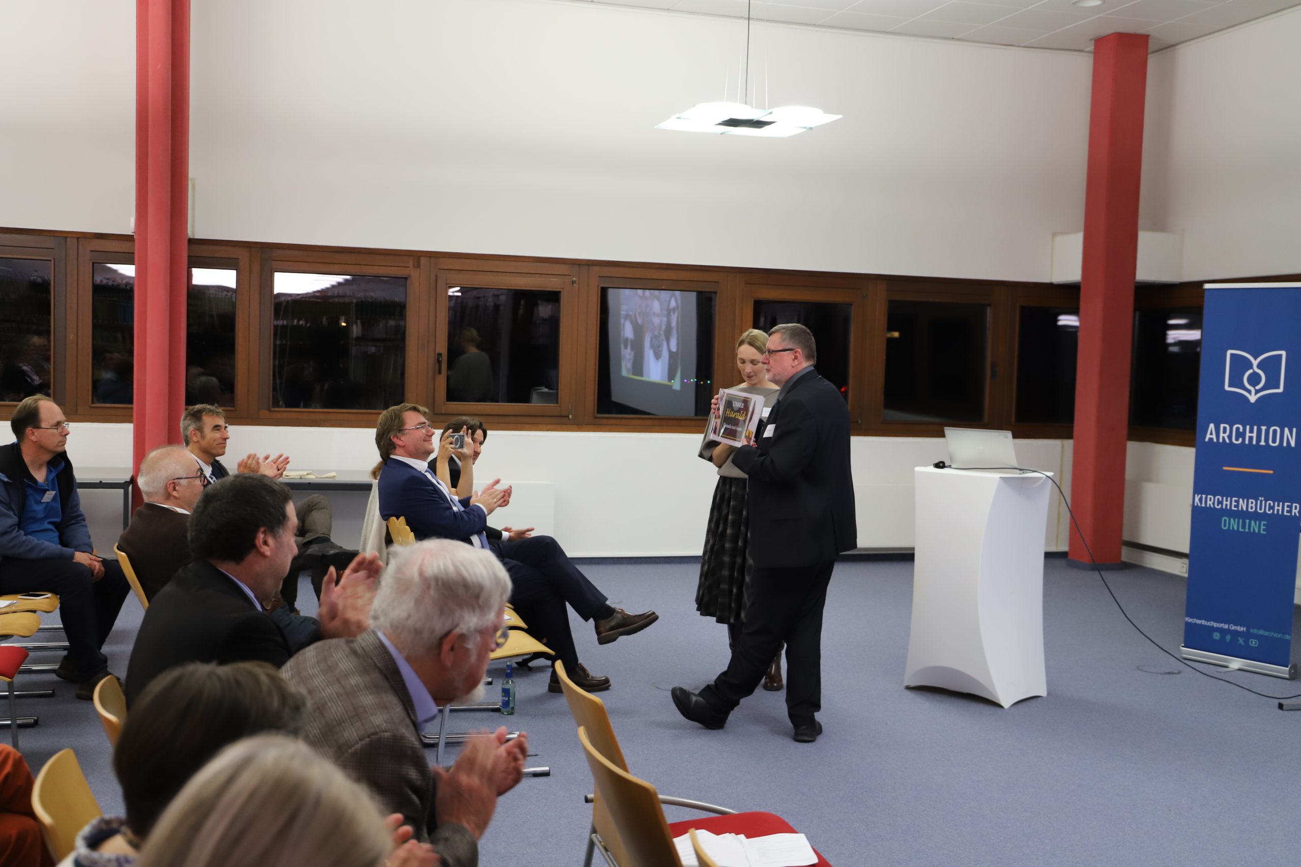 Vom 29. September bis zum 1. Oktober 2025 fand im Haus Birkach, dem Studienzentrum der Evangelischen Landeskirche in Württemberg, die 15. Jahrestagung der Arbeitsgemeinschaft der Archive und Bibliotheken in der Evangelischen Kirche statt. Das Tagungsthema lautete: „Demokratie braucht verlässliche Information“: Kirchliche Archive und Bibliotheken als Organisationen demokratischer Kultur. Ein Programmpunkt der Tagung waren Führungen durch das Archiv und die EHZ-Bibliothek in Stuttgart-Möhringen. Dabei stießen vor allem unser neuer Erweiterungsbau und die Fusion der Karlsruher und Stuttgarter Institutionen auf großes Interesse. Anschließend fand die feierliche Verabschiedung des Archion-Geschäftsführers Harald Müller-Baur statt, wozu sich noch viele weitere Gäste einfanden. Harald Müller-Baur ist in unserem Hause sehr bekannt, da er von 1990 bis 2013 als Sprengelarchivar im Landeskirchlichen Archiv Stuttgart tätig war.