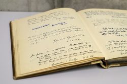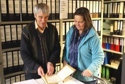 Doch kleinere geschlossene Teilbestände sind bereits nach Stuttgart-Möhringen umgezogen und wurden kurz vor Weihnachten ins dortige Magazin verbracht: Darunter Personalunterlagen, Fotos, Tonbänder, Alben – und das älteste Gästebuch. Auf dessen ersten Seiten trugen sich bald nach der Eröffnung Landesbischof Theophil Wurm oder der damalige Kultusminister Theodor Heuss ein.